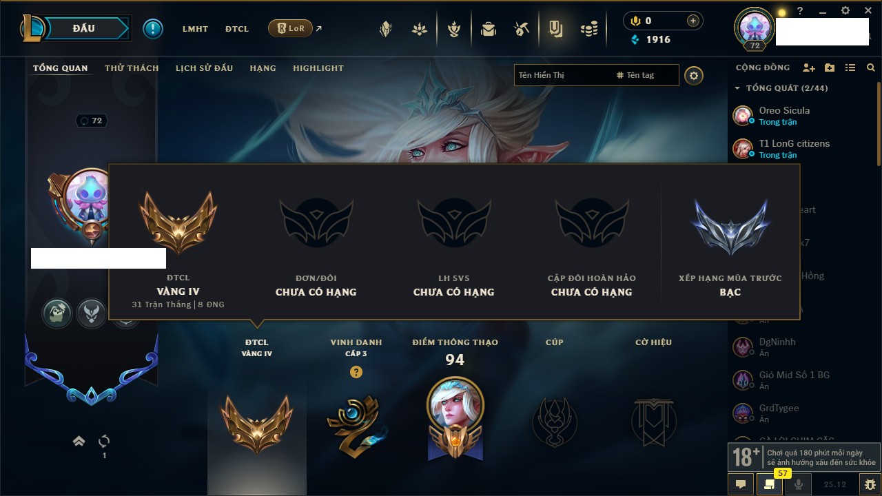 Rank Đơn: Đồng IIIKhung: ĐồngTướng: 95 - Còn 35210 THXTrang Phục: 17Rank ĐTCL: Bạc ILinh Thú: 46