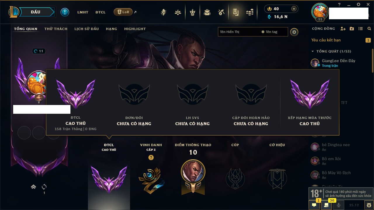 Rank Đơn: Vàng IIIKhung: BạcTướng: 171 - Còn 101359 THXTrang Phục: 88Rank ĐTCL: Kim Cương IVLinh Thú: 200