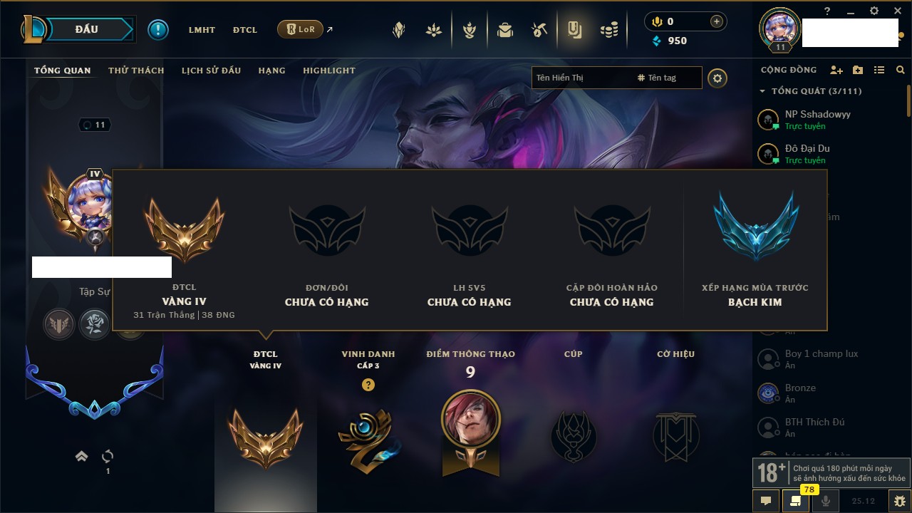 Rank Đơn: Vàng IKhung: BạcTướng: 171 - Còn 60584 THXTrang Phục: 286Rank ĐTCL: Vàng IIILinh Thú: 117