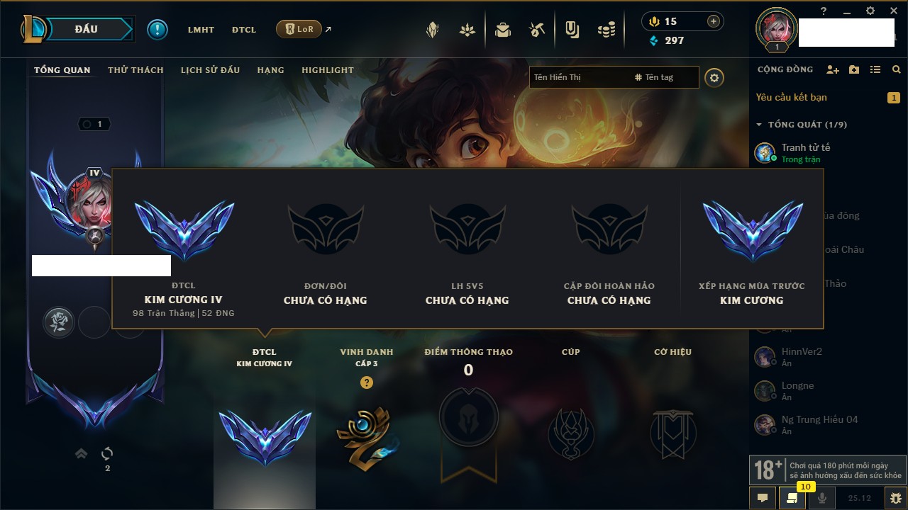 Rank Đơn: Vàng IKhung: BạcTướng: 171 - Còn 60584 THXTrang Phục: 286Rank ĐTCL: Vàng IIILinh Thú: 117