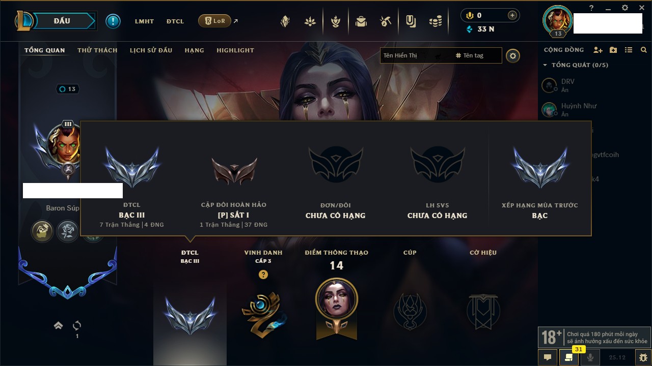 Rank Đơn: Bạch Kim IIIKhung: VàngTướng: 126 - Còn 23055 THXTrang Phục: 114Rank ĐTCL: Chưa RankLinh Thú: 21