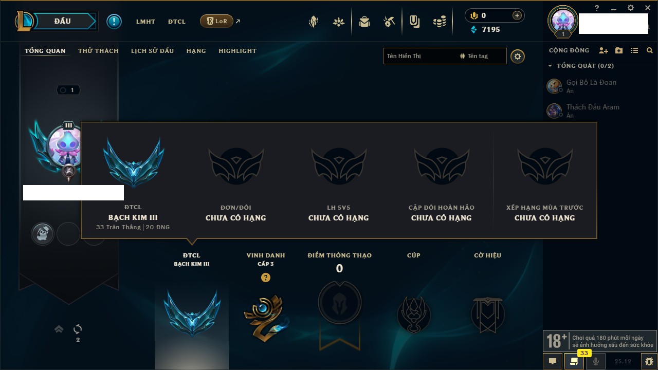 Rank Đơn: Bạch Kim IVKhung: VàngTướng: 170 - Còn 30440 THXTrang Phục: 205Rank ĐTCL: Chưa RankLinh Thú: 88
