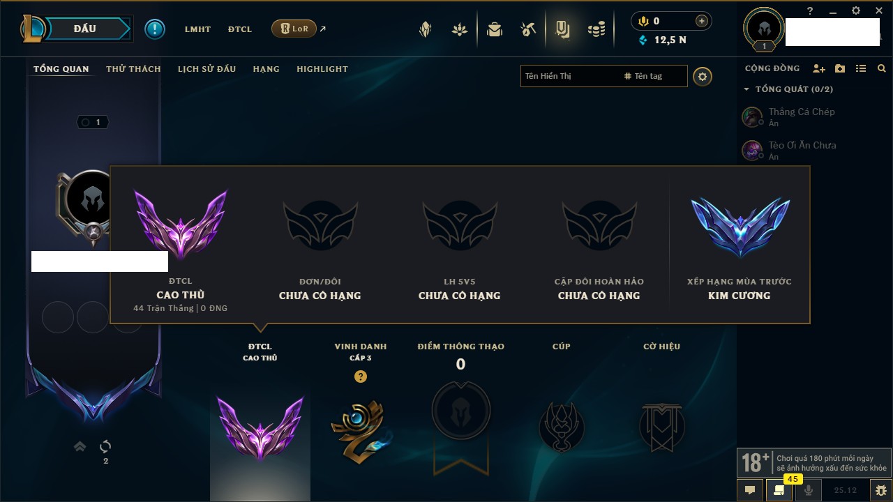 Rank Đơn: Chưa rank mùa nàoKhung: Chưa có khungTướng: 4 - Còn 12000 THXTrang Phục: 0Rank ĐTCL: Bạch Kim IIILinh Thú: 20