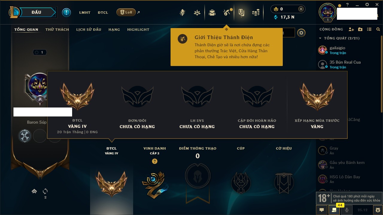 Rank Đơn: Vàng IKhung: BạcTướng: 171 - Còn 60584 THXTrang Phục: 286Rank ĐTCL: Vàng IIILinh Thú: 117