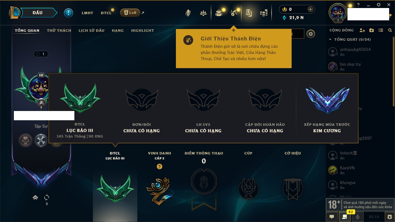Rank Đơn: Vàng IKhung: Bạch kimTướng: 170 - Còn 212450 THXTrang Phục: 214Rank ĐTCL: Bạch Kim IVLinh Thú: 221