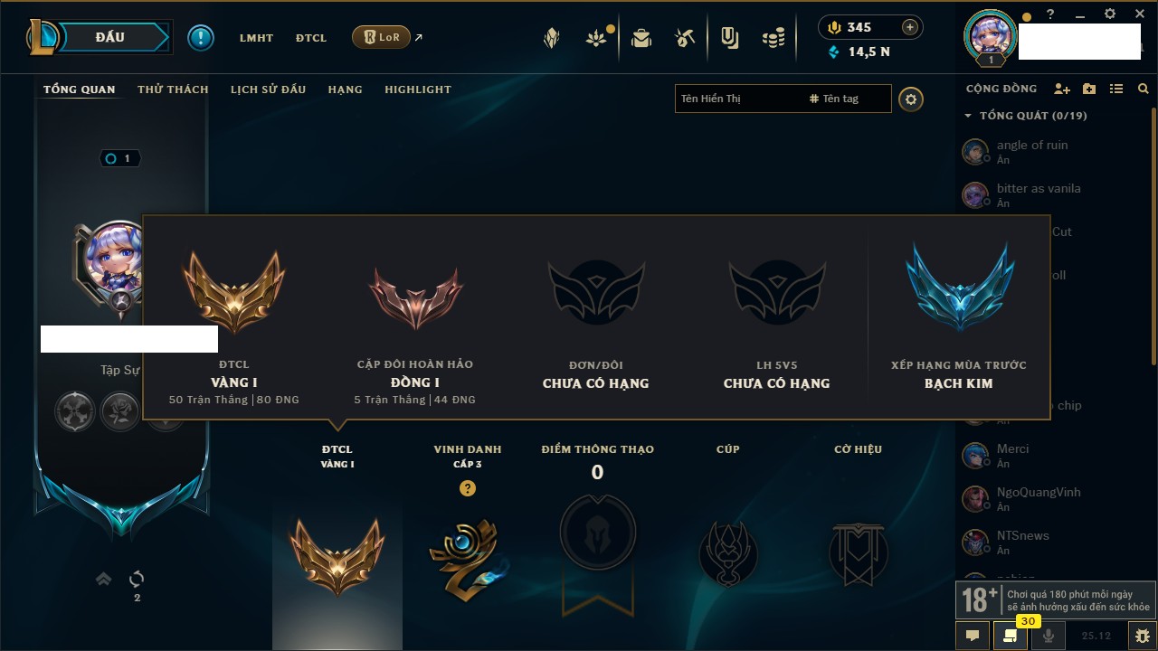 Rank Đơn: Vàng IKhung: Bạch kimTướng: 170 - Còn 212450 THXTrang Phục: 214Rank ĐTCL: Bạch Kim IVLinh Thú: 221
