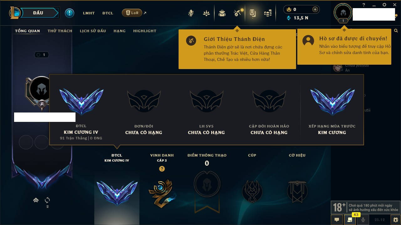 Rank Đơn: Bạc IIKhung: VàngTướng: 171 - Còn 332462 THXTrang Phục: 165Rank ĐTCL: Kim Cương IVLinh Thú: 181