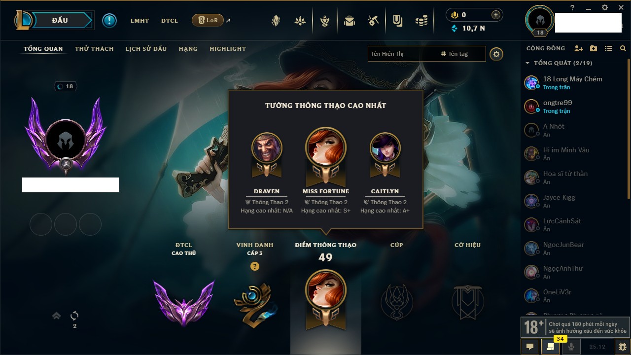 Rank Đơn: Đồng IIIKhung: ĐồngTướng: 170 - Còn 48082 THXTrang Phục: 272Rank ĐTCL: Chưa RankLinh Thú: 84