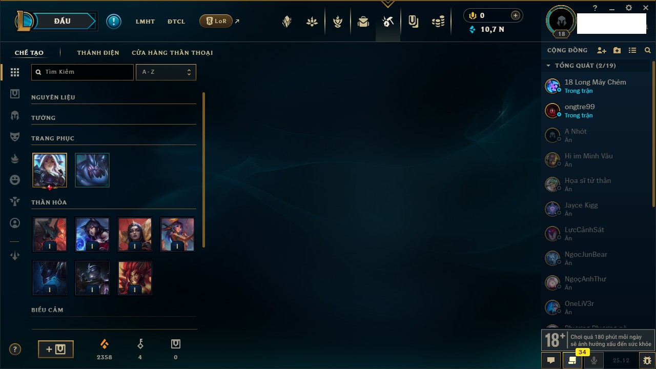 Rank Đơn: Bạch Kim IVKhung: Bạch kimTướng: 171 - Còn 182788 THXTrang Phục: 158Rank ĐTCL: Lục Bảo IVLinh Thú: 56
