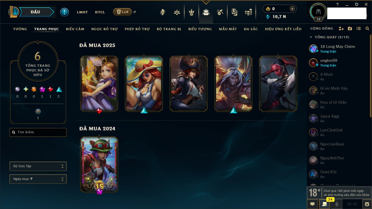 Rank Đơn: Vàng IVKhung: VàngTướng: 171 - Còn 175357 THXTrang Phục: 348Rank ĐTCL: Chưa RankLinh Thú: 46