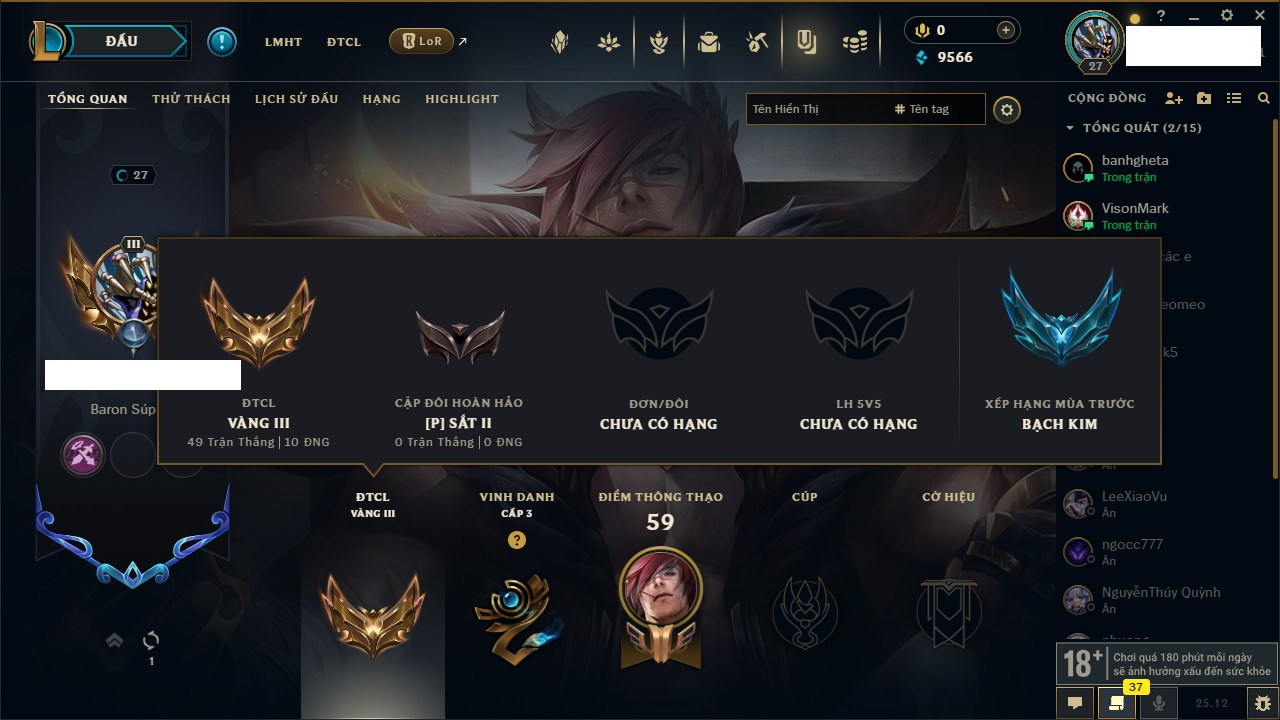 Rank Đơn: Bạch Kim IIIKhung: Bạch kimTướng: 170 - Còn 61079 THXTrang Phục: 352Rank ĐTCL: Sắt IILinh Thú: 70