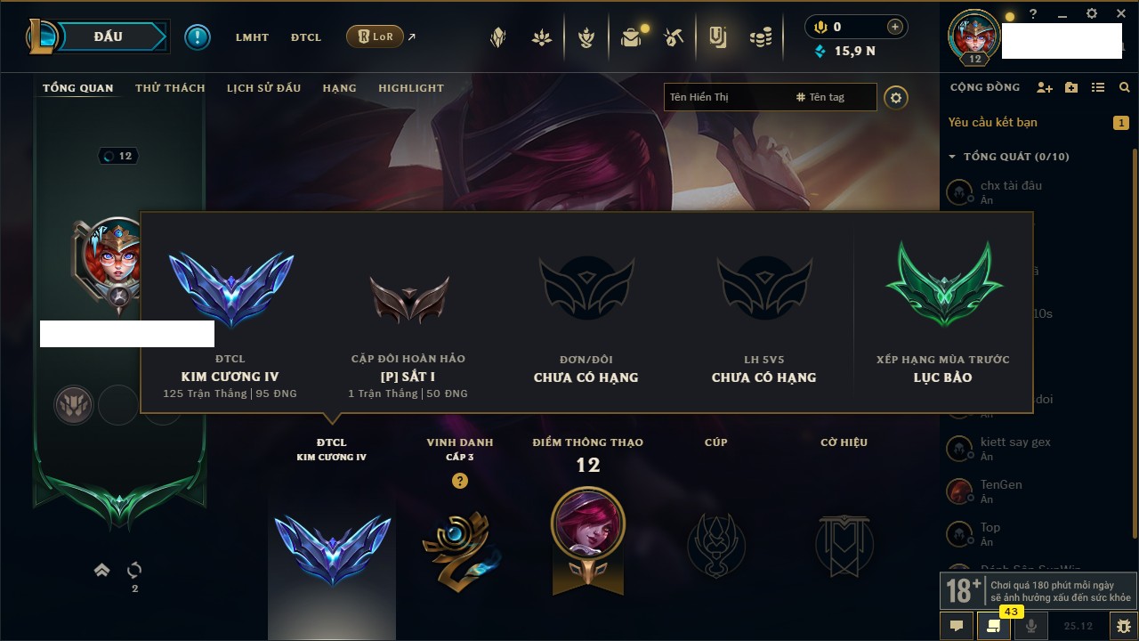 Rank Đơn: Vàng IKhung: BạcTướng: 171 - Còn 60584 THXTrang Phục: 286Rank ĐTCL: Vàng IIILinh Thú: 117