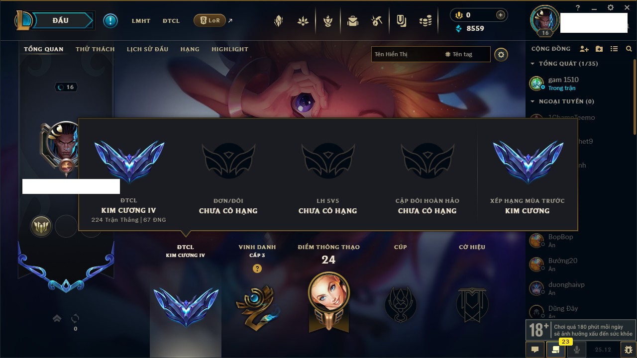 Rank Đơn: Chưa rank mùa nàoKhung: Chưa có khungTướng: 24 - Còn 30580 THXTrang Phục: 4Rank ĐTCL: Bạch Kim IIILinh Thú: 122