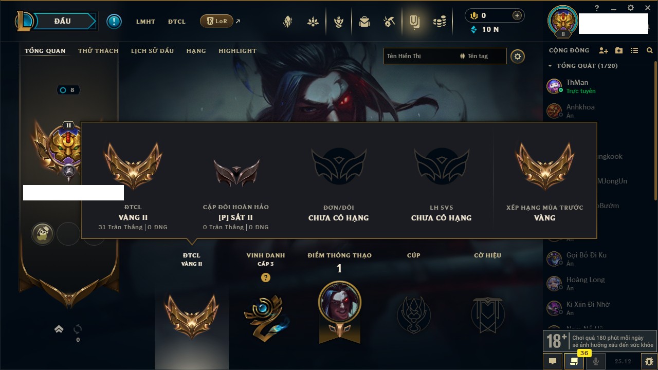 Rank Đơn: Vàng IIIKhung: BạcTướng: 171 - Còn 101359 THXTrang Phục: 88Rank ĐTCL: Kim Cương IVLinh Thú: 200