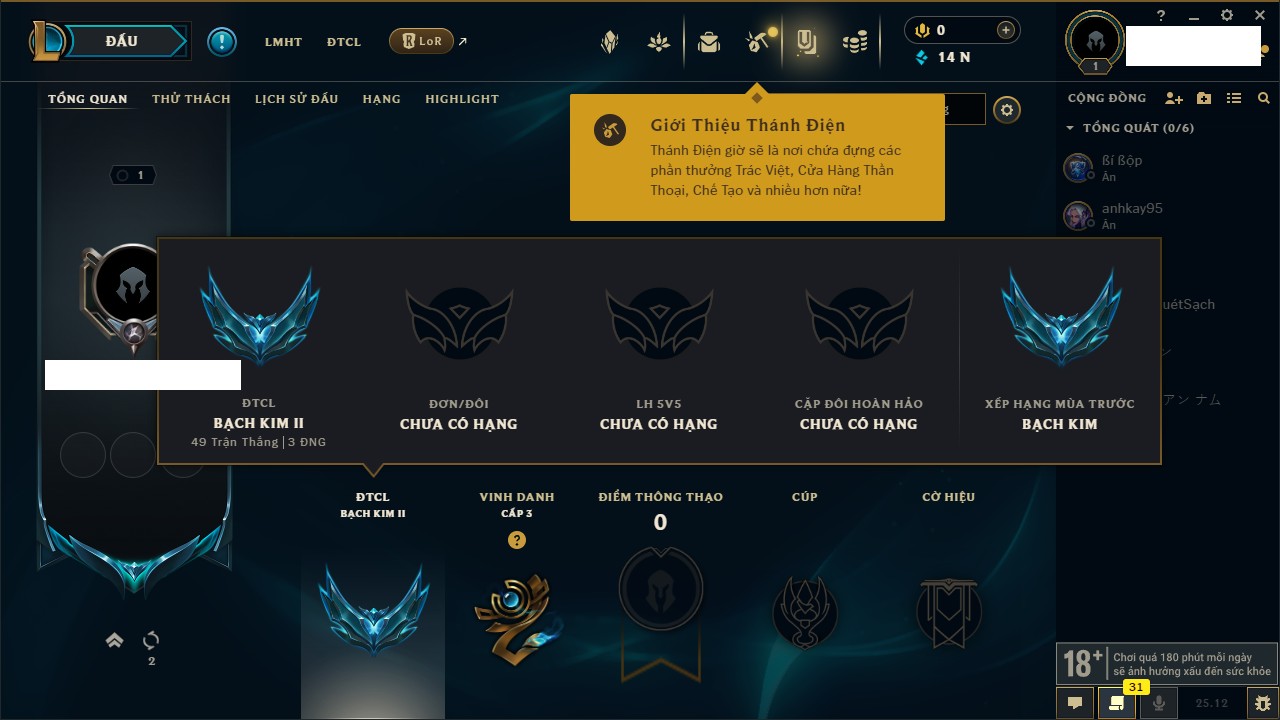 Rank Đơn: Vàng IIIKhung: BạcTướng: 171 - Còn 101359 THXTrang Phục: 88Rank ĐTCL: Kim Cương IVLinh Thú: 200