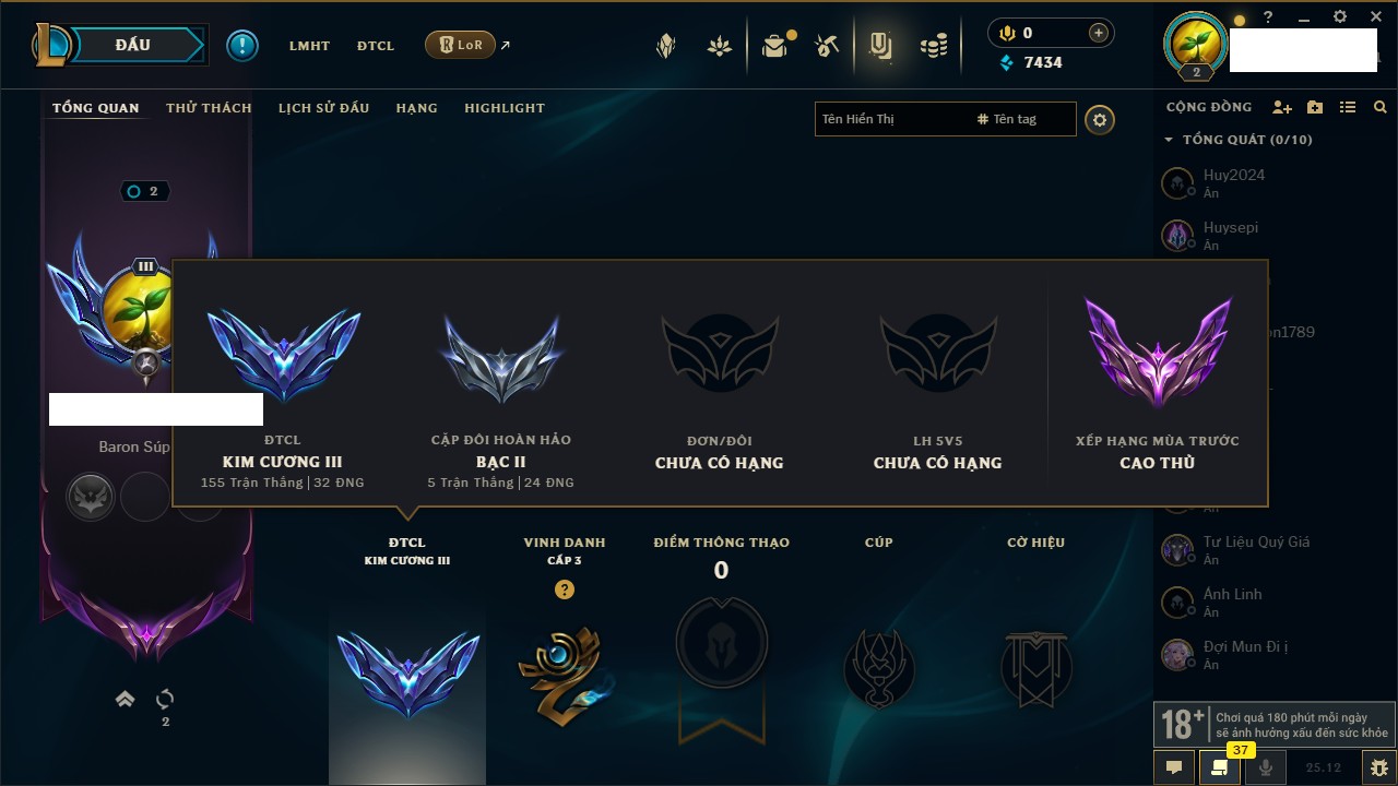 Rank Đơn: Chưa rank mùa nàoKhung: Chưa có khungTướng: 2 - Còn 9000 THXTrang Phục: 0Rank ĐTCL: Bạch Kim IIILinh Thú: 31