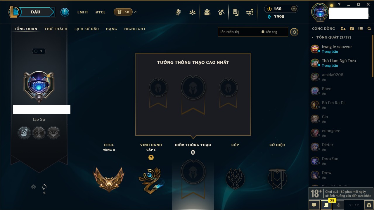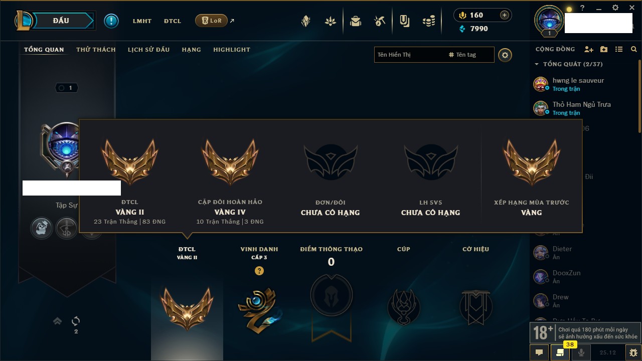 Rank Đơn: Vàng IIIKhung: BạcTướng: 171 - Còn 101359 THXTrang Phục: 88Rank ĐTCL: Kim Cương IVLinh Thú: 200