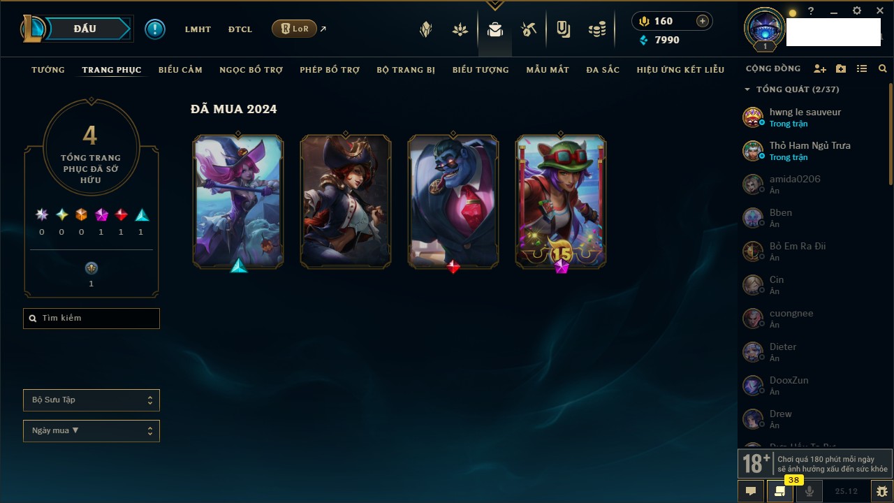 Rank Đơn: Lục Bảo IVKhung: Bạch kimTướng: 171 - Còn 128452 THXTrang Phục: 193Rank ĐTCL: Bạc IIILinh Thú: 100