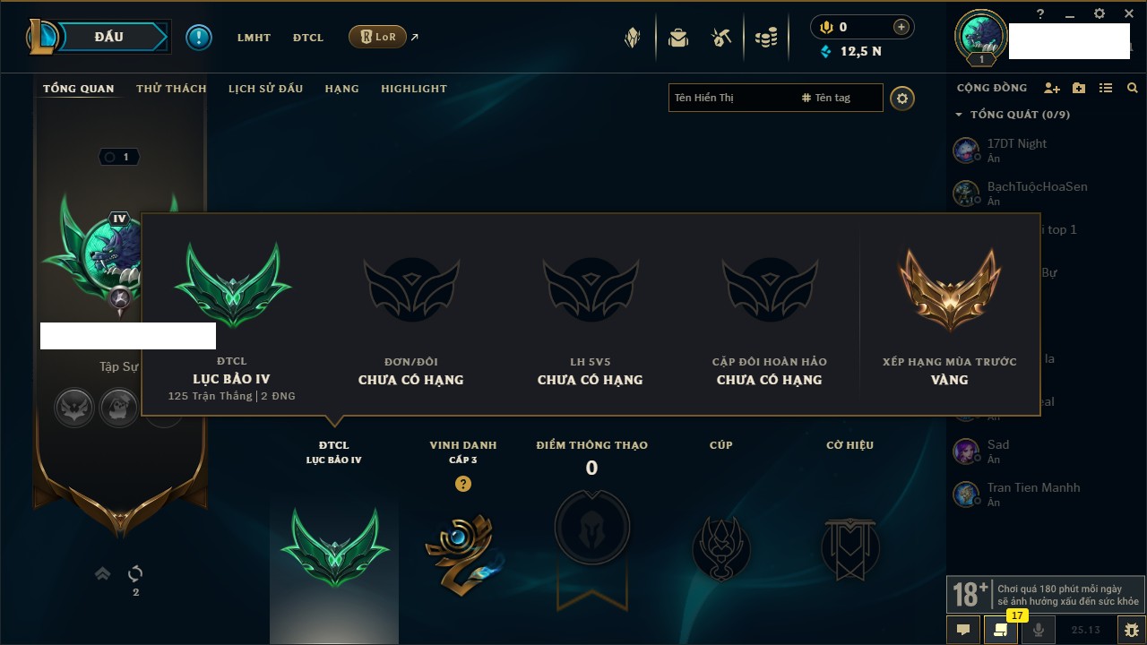 Rank Đơn: Chưa RankKhung: Chưa có khungTướng: 2 - Còn 3450 THXTrang Phục: 0Rank ĐTCL: Chưa RankLinh Thú: 7