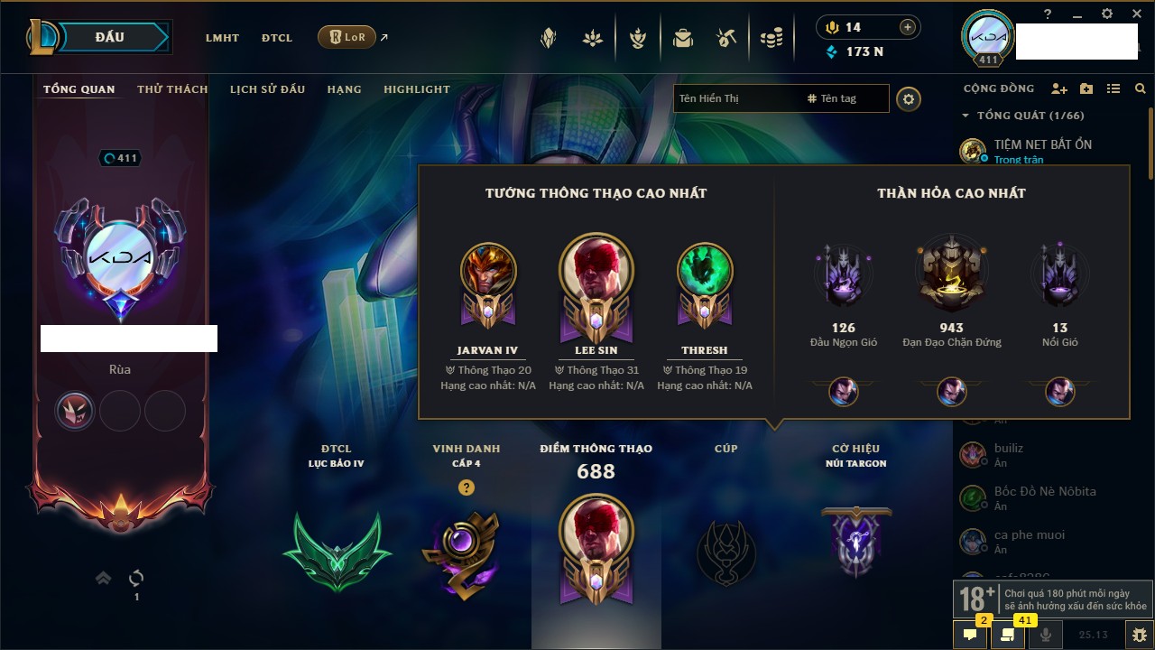 Rank Đơn: Bạch Kim IIKhung: Bạch kimTướng: 171 - Còn 97913 THXTrang Phục: 261Rank ĐTCL: Chưa RankLinh Thú: 46