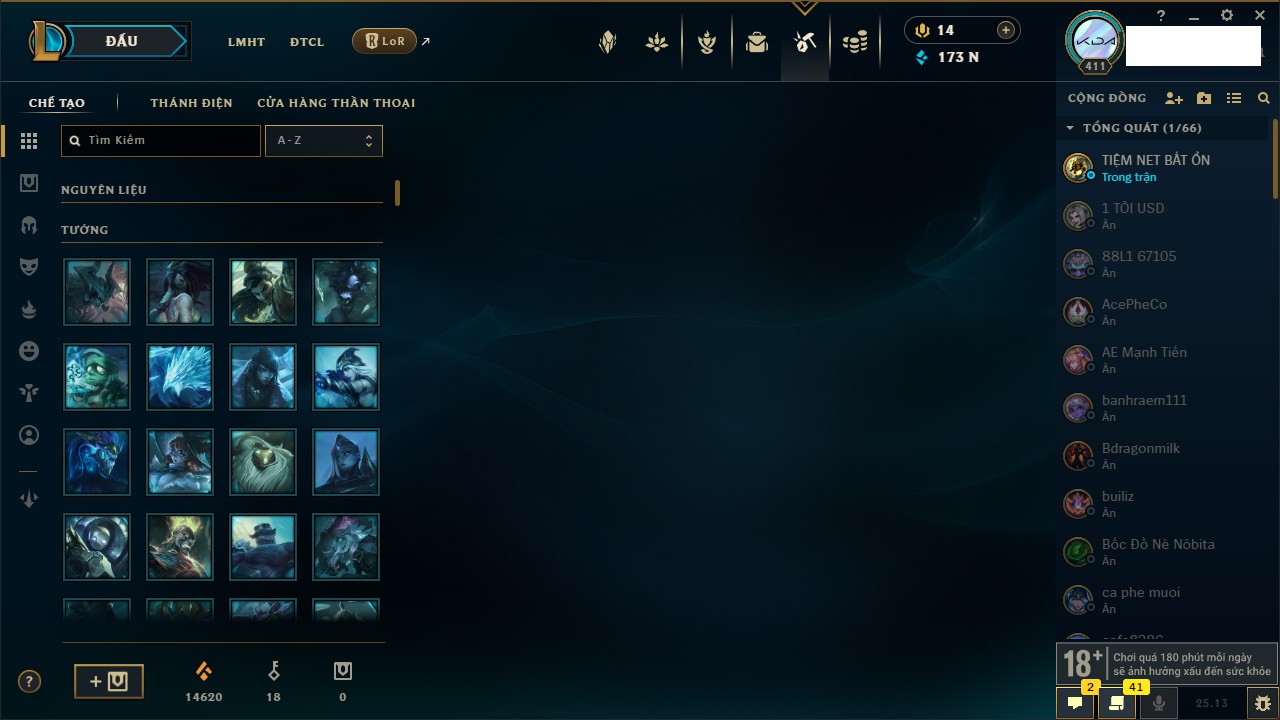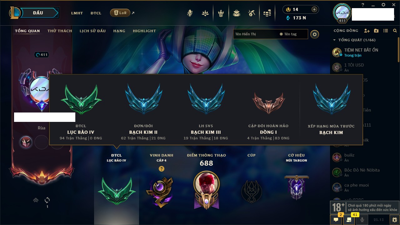Rank Đơn: Bạch Kim IIKhung: Bạch kimTướng: 171 - Còn 316137 THXTrang Phục: 89Rank ĐTCL: Bạch Kim IIILinh Thú: 94