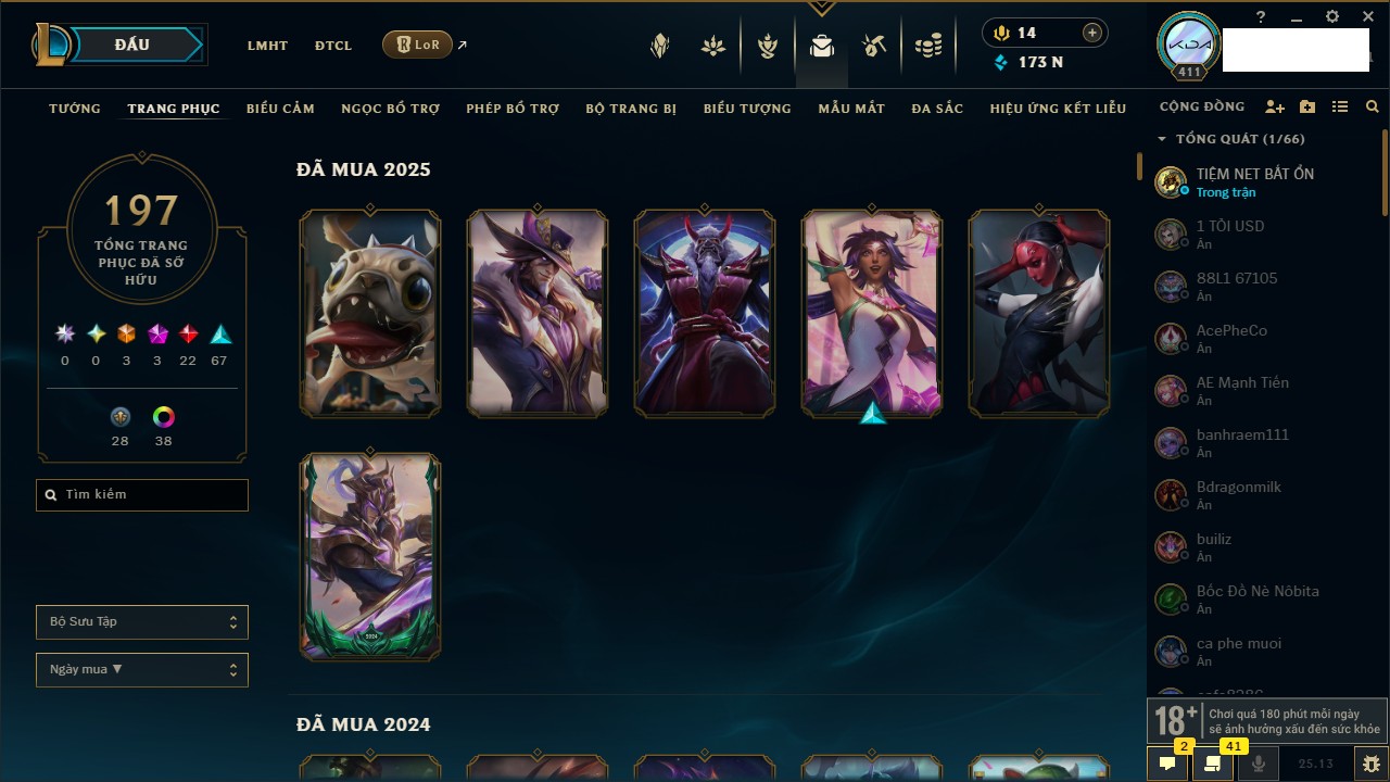 Rank Đơn: Vàng IIKhung: VàngTướng: 170 - Còn 243330 THXTrang Phục: 230Rank ĐTCL: Chưa RankLinh Thú: 68