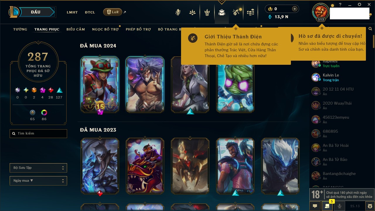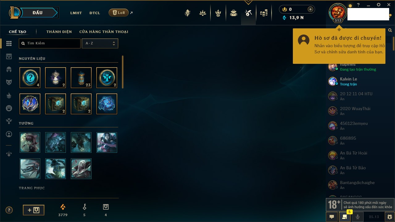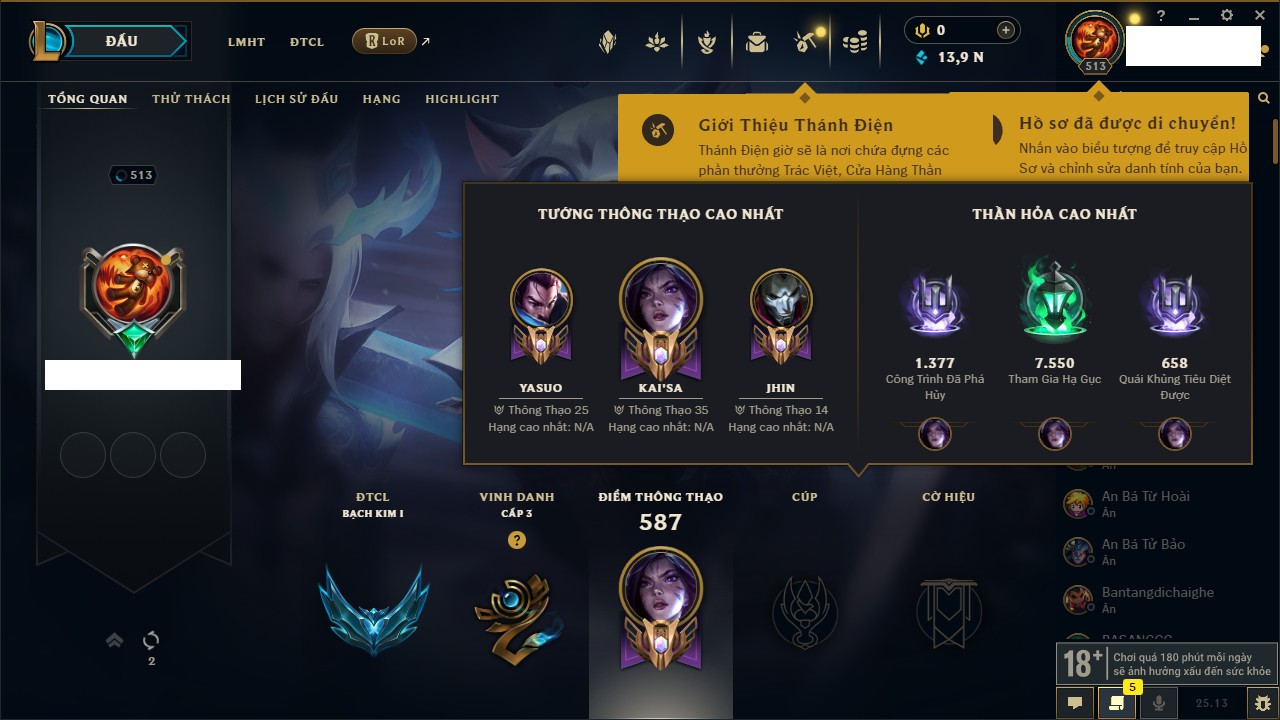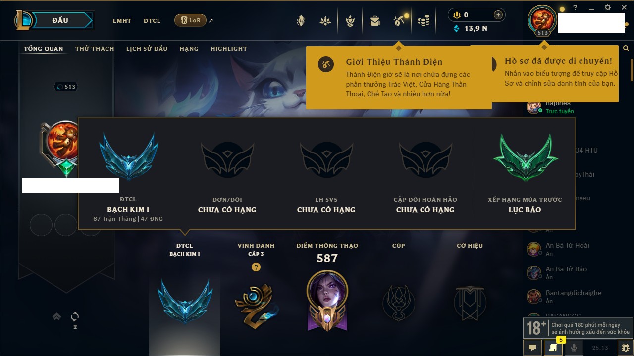 Rank Đơn: Bạch Kim IVKhung: VàngTướng: 171 - Còn 130578 THXTrang Phục: 253Rank ĐTCL: Chưa RankLinh Thú: 20