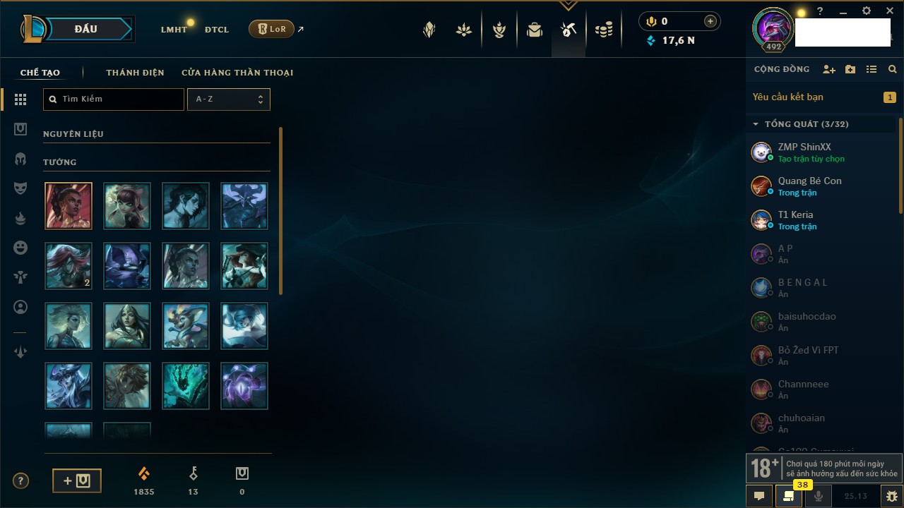 Rank Đơn: Lục Bảo IVKhung: VàngTướng: 171 - Còn 154648 THXTrang Phục: 203Rank ĐTCL: Bạch Kim IVLinh Thú: 69