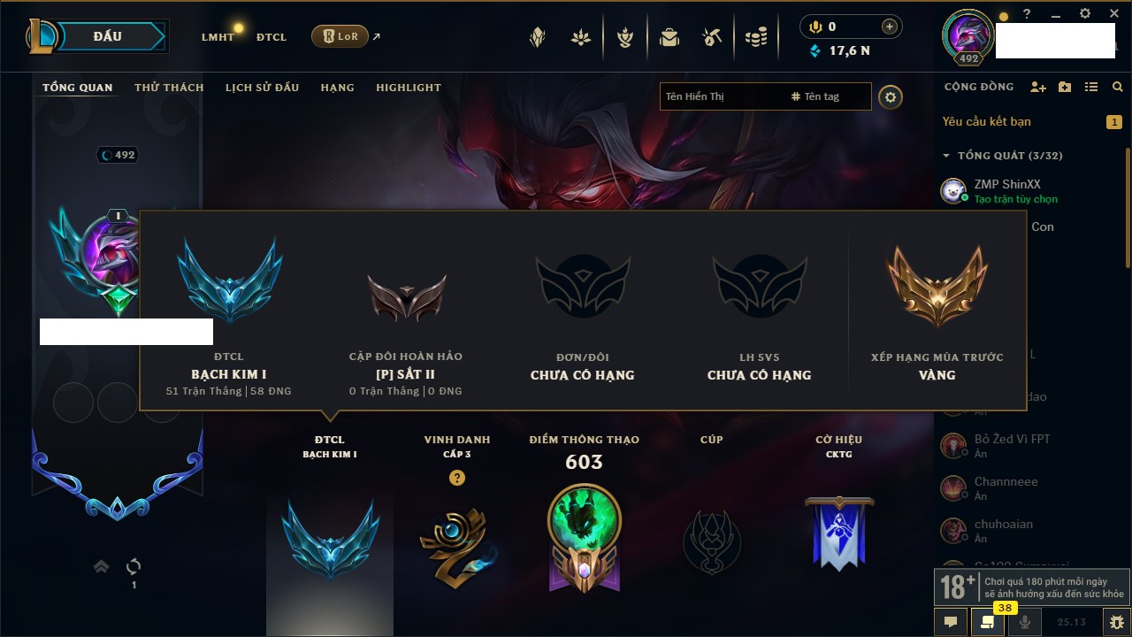 Rank Đơn: Bạch Kim IIKhung: Bạch kimTướng: 171 - Còn 316137 THXTrang Phục: 89Rank ĐTCL: Bạch Kim IIILinh Thú: 94