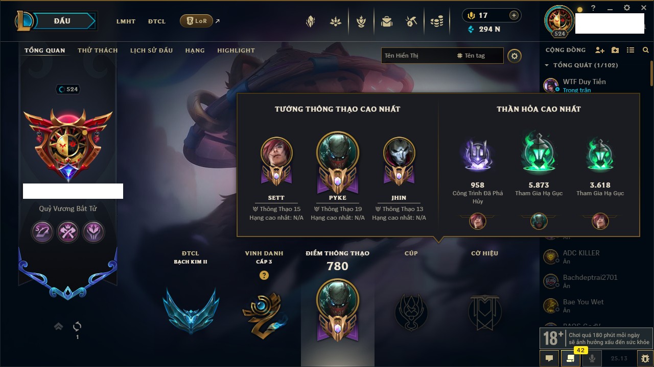 Rank Đơn: Bạch Kim IKhung: Bạch kimTướng: 171 - Còn 131918 THXTrang Phục: 297Rank ĐTCL: Chưa RankLinh Thú: 118