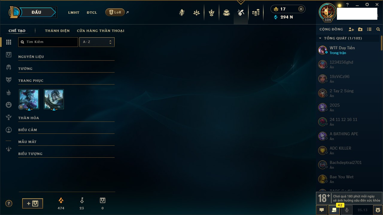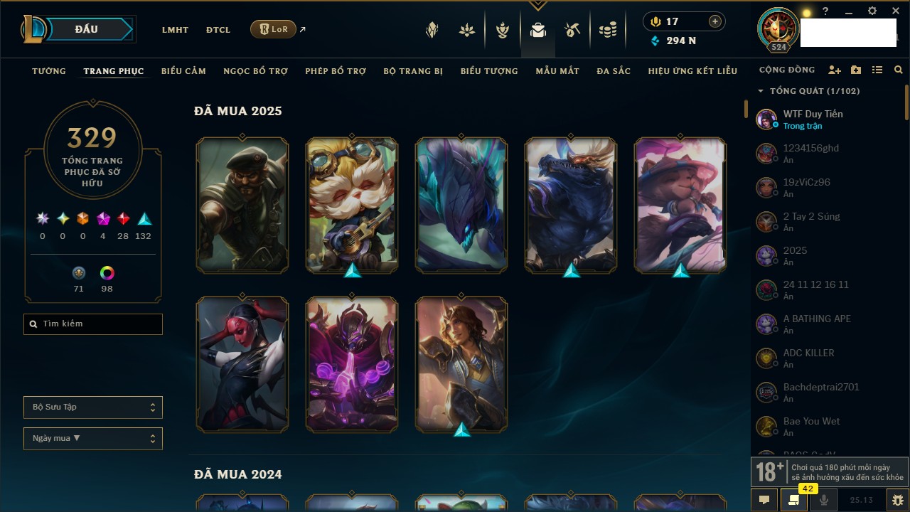 Rank Đơn: Vàng IIIKhung: VàngTướng: 171 - Còn 88128 THXTrang Phục: 329Rank ĐTCL: Chưa RankLinh Thú: 41