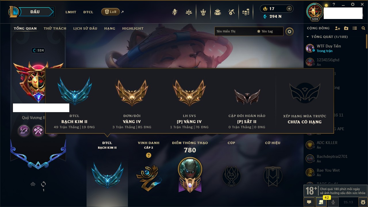 Rank Đơn: Đồng IIKhung: ĐồngTướng: 171 - Còn 142181 THXTrang Phục: 272Rank ĐTCL: Chưa RankLinh Thú: 78