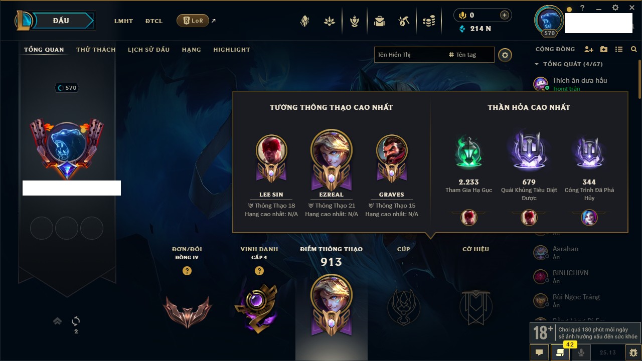 Rank Đơn: Đồng IIKhung: Chưa có khungTướng: 170 - Còn 2078 THXTrang Phục: 72Rank ĐTCL: Đồng ILinh Thú: 133