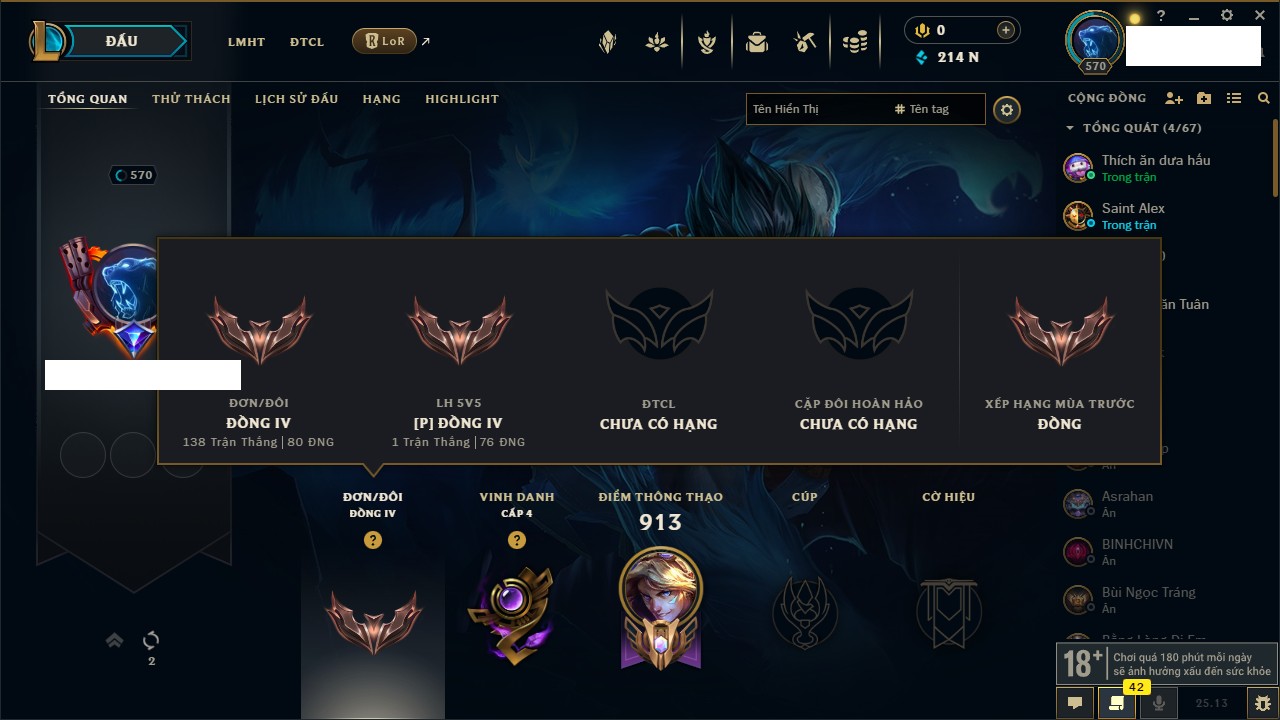 Rank Đơn: Lục Bảo IVKhung: VàngTướng: 171 - Còn 154648 THXTrang Phục: 203Rank ĐTCL: Bạch Kim IVLinh Thú: 69