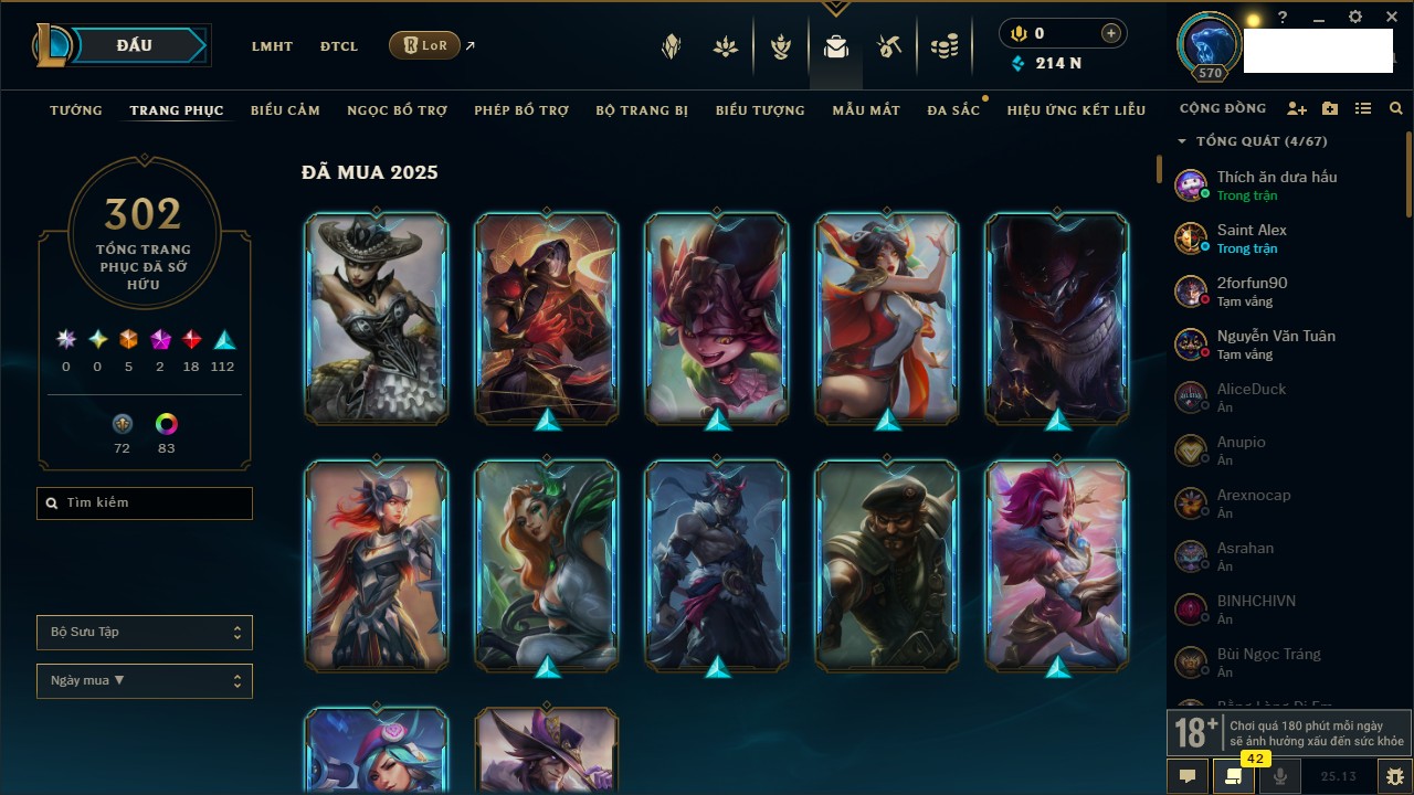 Rank Đơn: Bạch Kim IIIKhung: Bạch kimTướng: 171 - Còn 136108 THXTrang Phục: 261Rank ĐTCL: Bạc IVLinh Thú: 73
