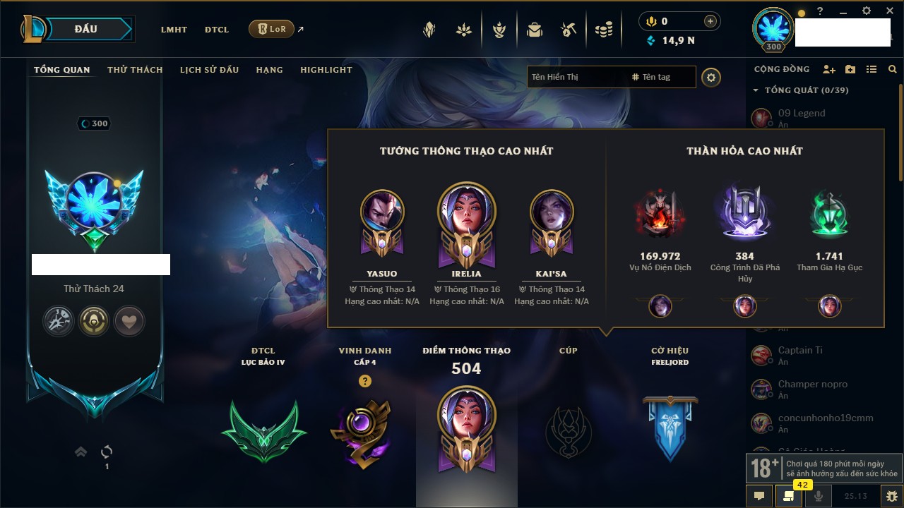 Rank Đơn: Bạch Kim IIKhung: Bạch kimTướng: 171 - Còn 316137 THXTrang Phục: 89Rank ĐTCL: Bạch Kim IIILinh Thú: 94