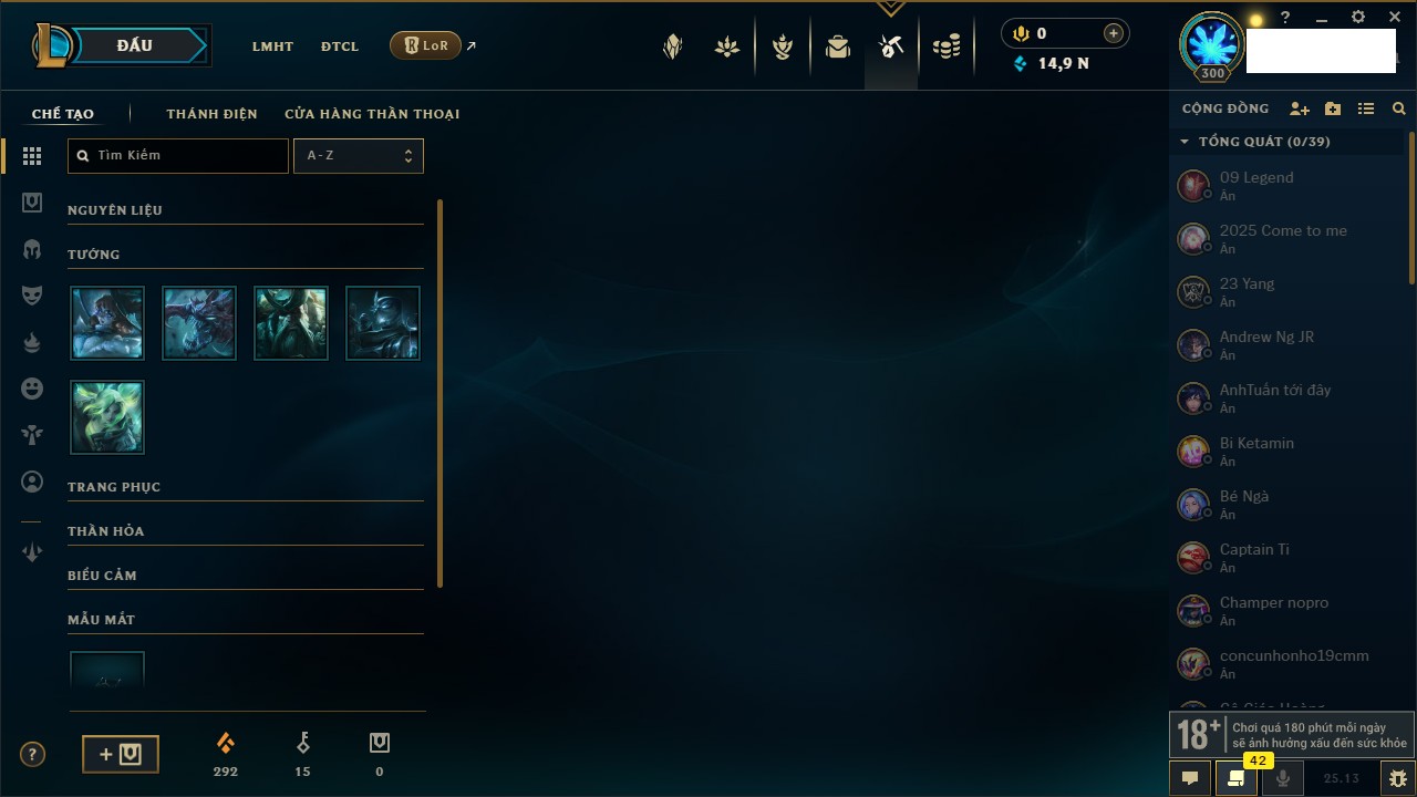 Rank Đơn: Lục Bảo IVKhung: VàngTướng: 171 - Còn 154648 THXTrang Phục: 203Rank ĐTCL: Bạch Kim IVLinh Thú: 69