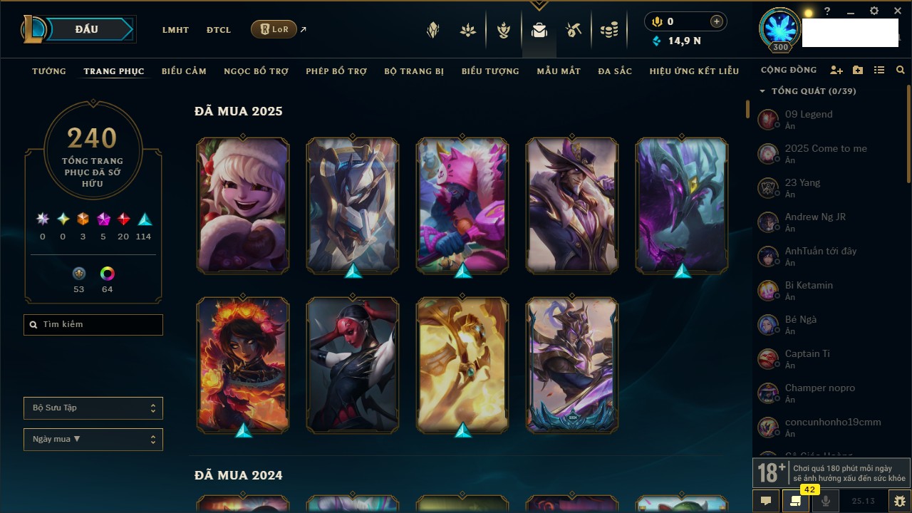 Rank Đơn: Vàng IIKhung: VàngTướng: 170 - Còn 243330 THXTrang Phục: 230Rank ĐTCL: Chưa RankLinh Thú: 68