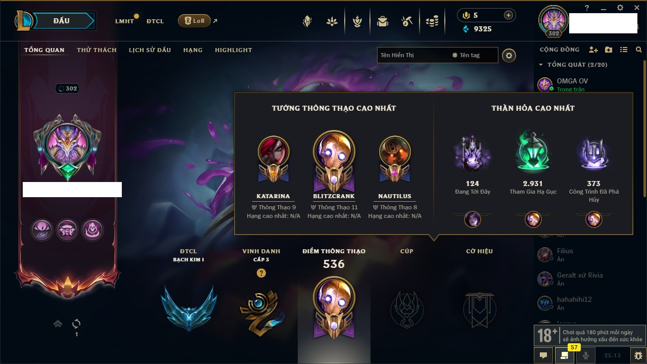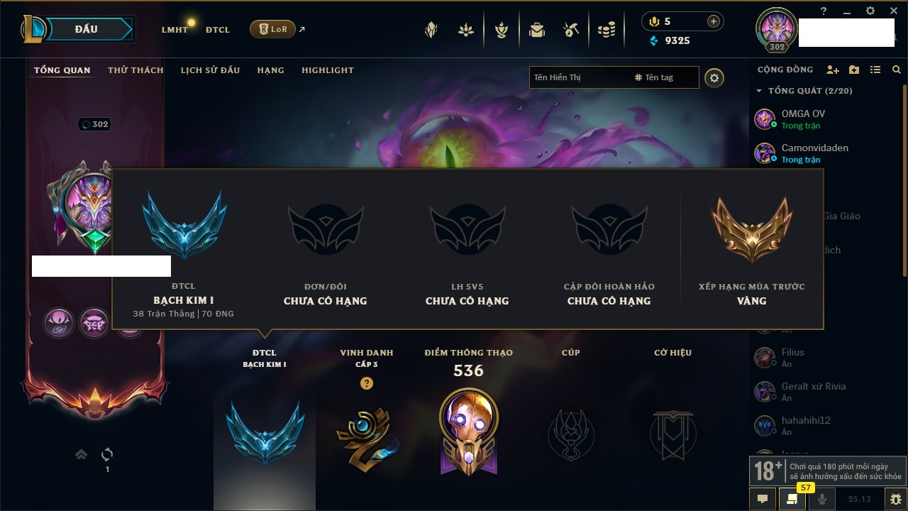 Rank Đơn: Bạc IIKhung: VàngTướng: 171 - Còn 332462 THXTrang Phục: 165Rank ĐTCL: Kim Cương IVLinh Thú: 181