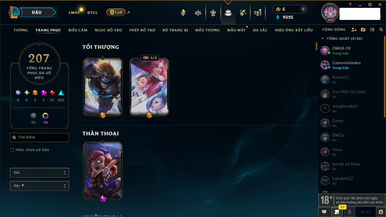 Rank Đơn: Vàng IVKhung: BạcTướng: 166 - Còn 180925 THXTrang Phục: 163Rank ĐTCL: Chưa RankLinh Thú: 67