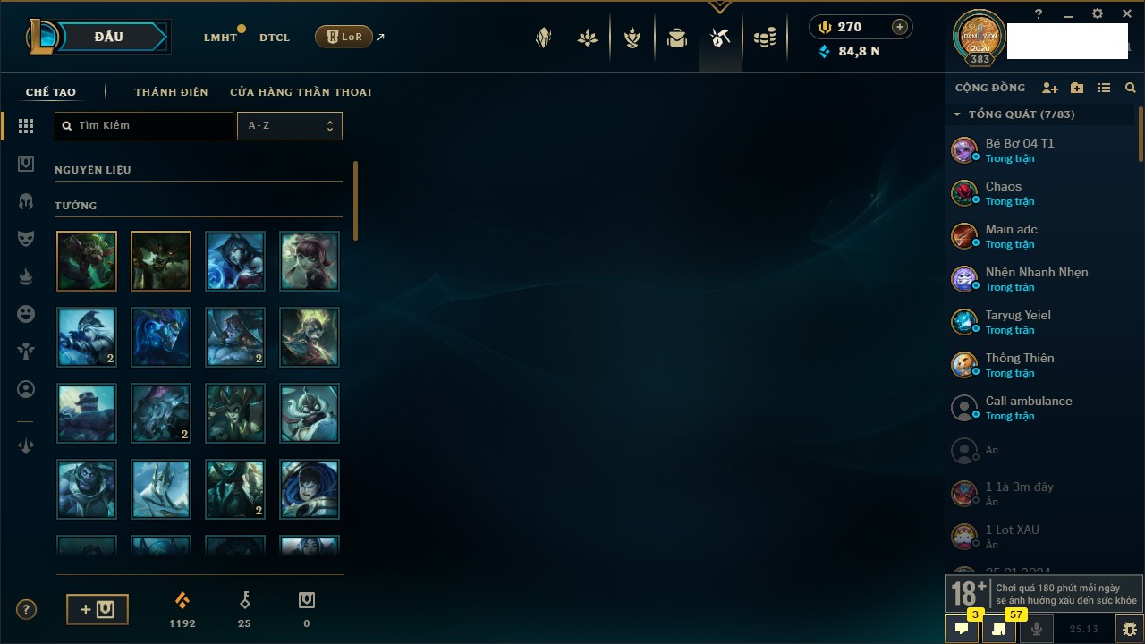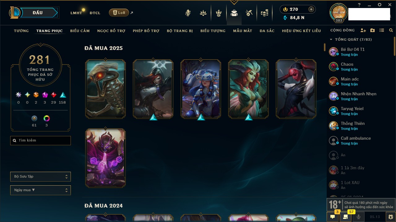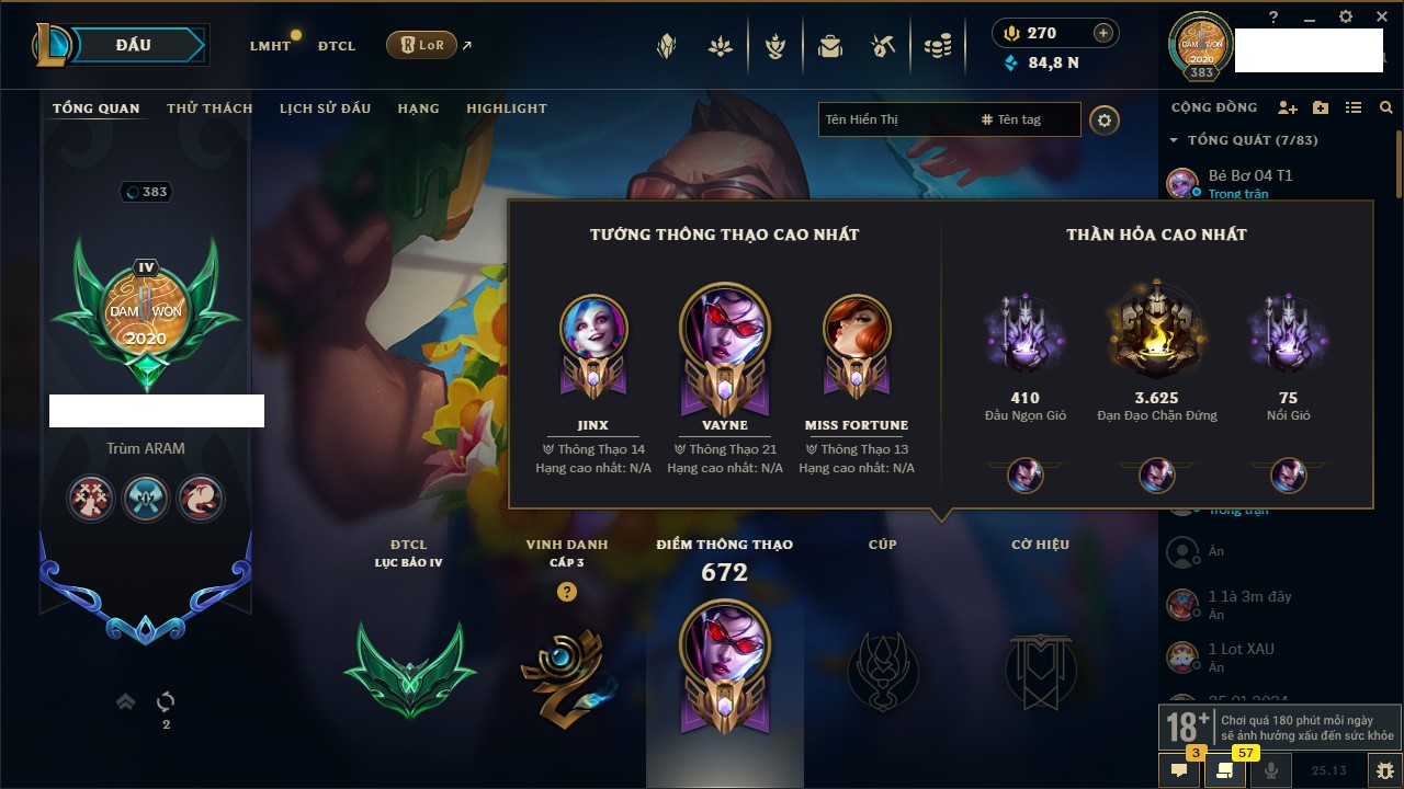 Rank Đơn: Vàng IIKhung: VàngTướng: 171 - Còn 219803 THXTrang Phục: 254Rank ĐTCL: Chưa RankLinh Thú: 78