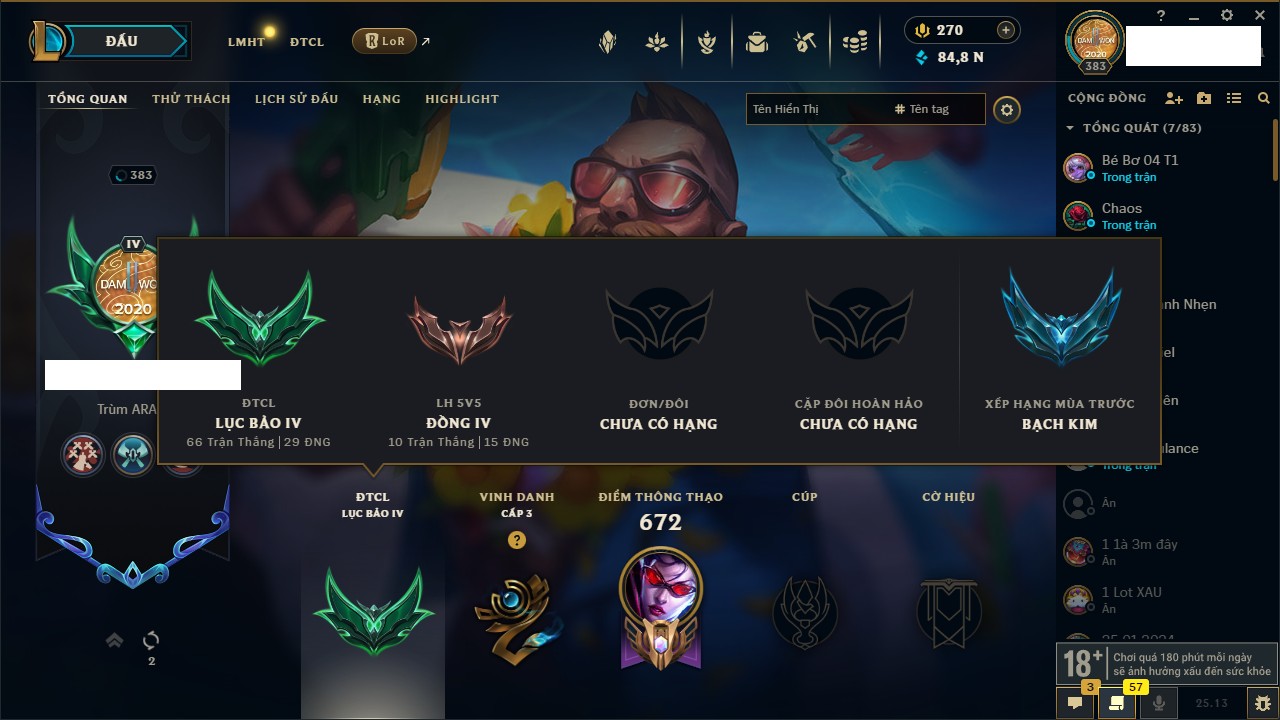 Rank Đơn: Bạc IVKhung: BạcTướng: 171 - Còn 173918 THXTrang Phục: 233Rank ĐTCL: Lục Bảo IIILinh Thú: 26