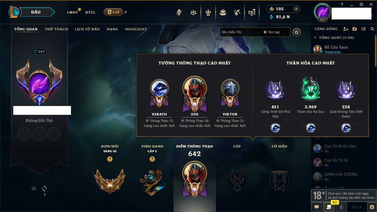 Rank Đơn: Sắt IVKhung: Chưa có khungTướng: 171 - Còn 9586 THXTrang Phục: 280Rank ĐTCL: Chưa RankLinh Thú: 114