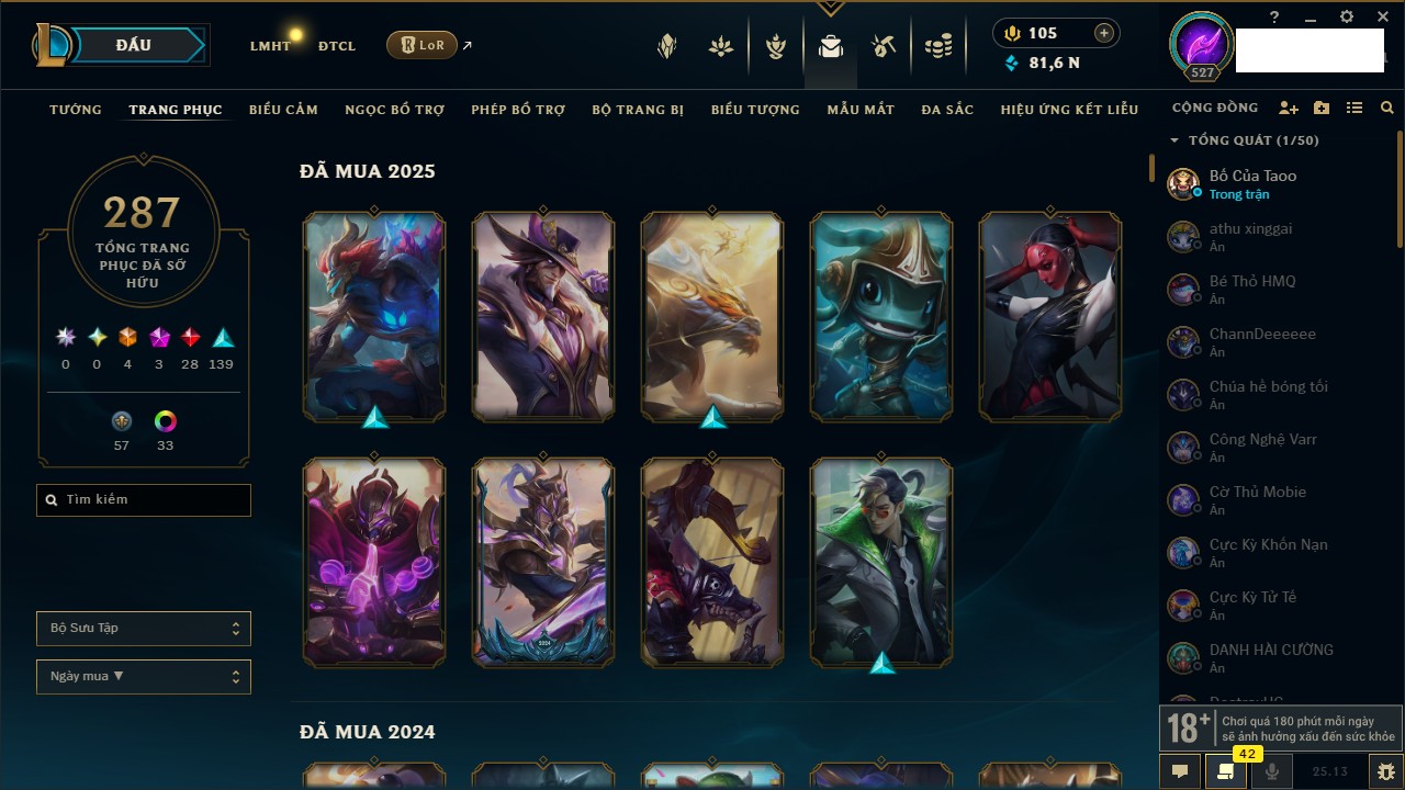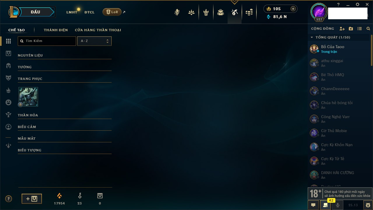 Rank Đơn: Vàng IIIKhung: Chưa có khungTướng: 171 - Còn 79750 THXTrang Phục: 288Rank ĐTCL: Chưa RankLinh Thú: 79