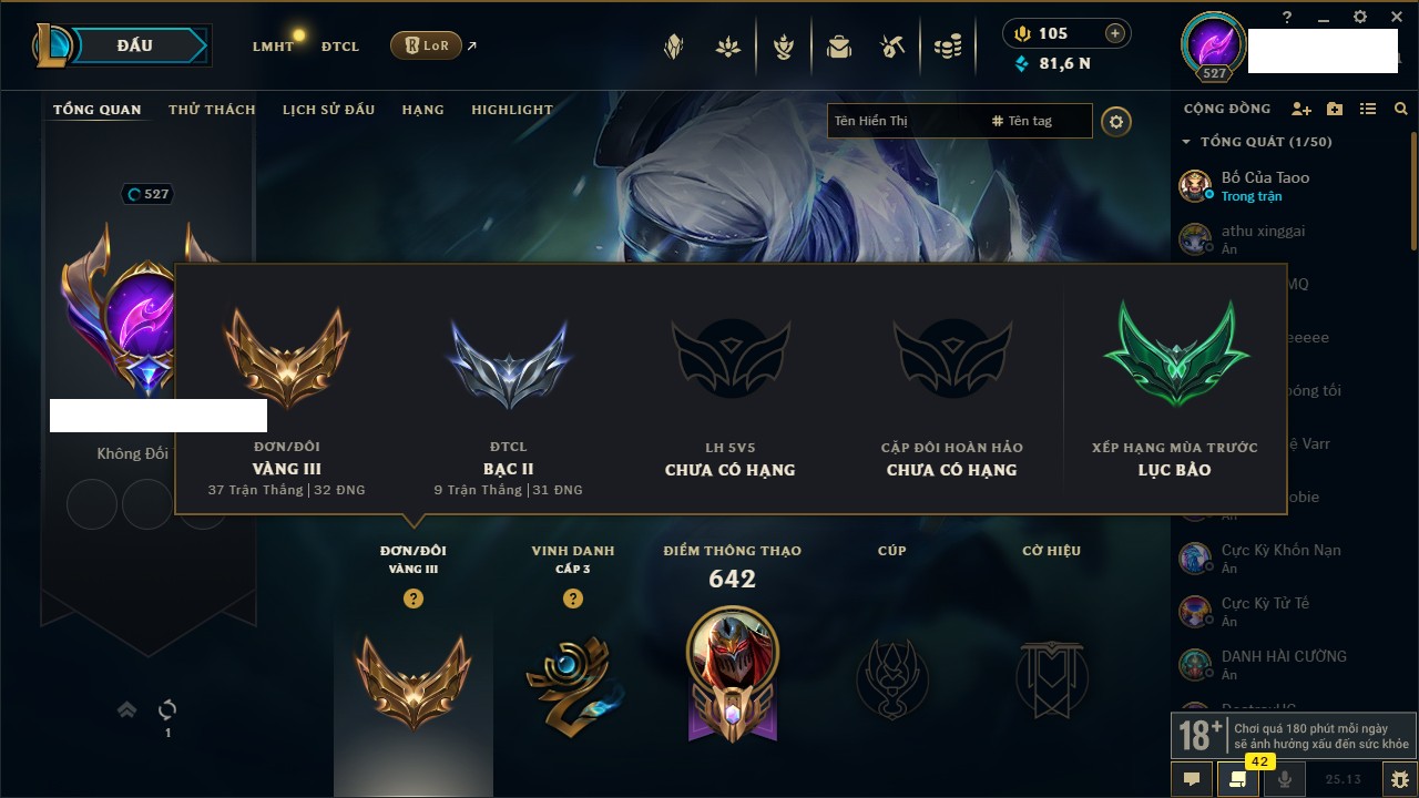 Rank Đơn: Bạch Kim IIIKhung: VàngTướng: 170 - Còn 106147 THXTrang Phục: 261Rank ĐTCL: Chưa RankLinh Thú: 89
