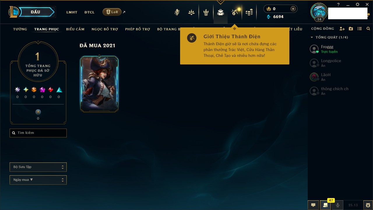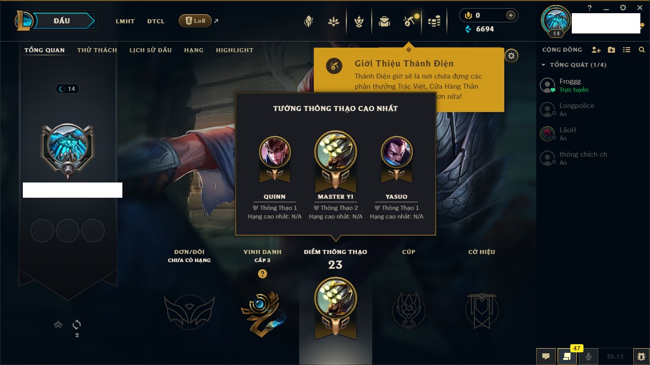 Rank Đơn: Vàng IVKhung: BạcTướng: 171 - Còn 426239 THXTrang Phục: 162Rank ĐTCL: Chưa RankLinh Thú: 33