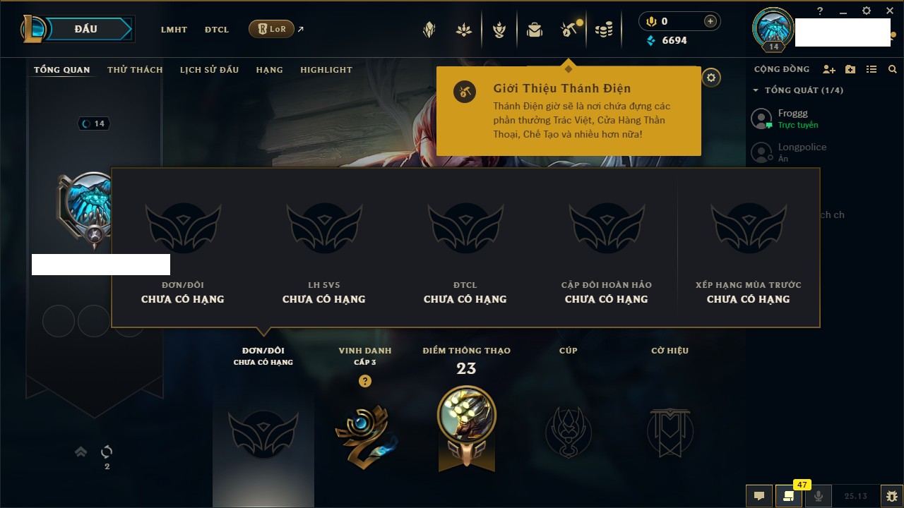Rank Đơn: Bạc IIKhung: VàngTướng: 171 - Còn 332462 THXTrang Phục: 165Rank ĐTCL: Kim Cương IVLinh Thú: 181