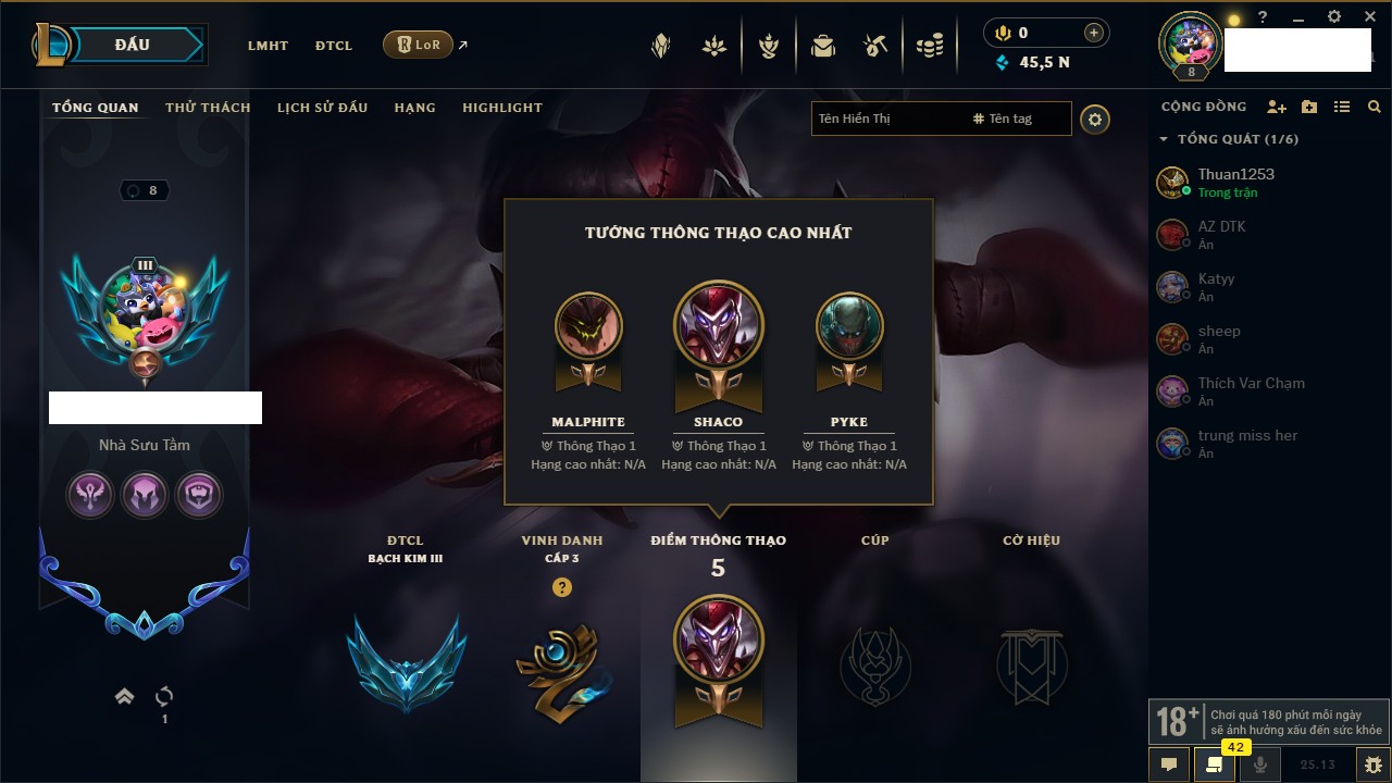 Rank Đơn: Bạch Kim III Khung: Bạch kim Tướng: 170 - Còn 43042 THX Trang Phục: 41 Rank ĐTCL: Bạc II Linh Thú: 96