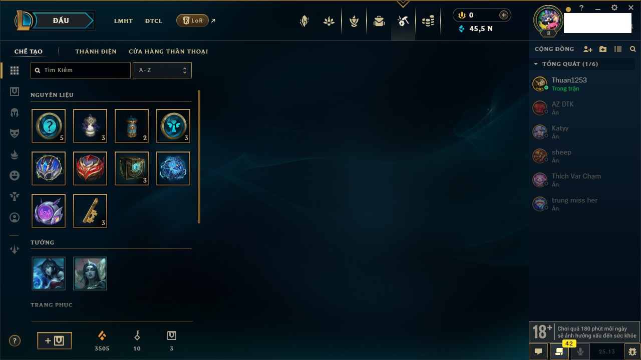 Rank Đơn: Chưa rank mùa nào Khung: Chưa có khung Tướng: 13 - Còn 6380 THX Trang Phục: 1 Rank ĐTCL: Bạch Kim III Linh Thú: 146