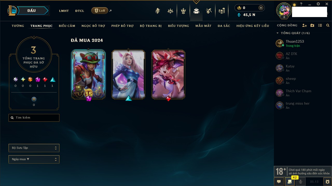Rank Đơn: Chưa rank mùa nào Khung: Chưa có khung Tướng: 117 - Còn 36585 THX Trang Phục: 3 Rank ĐTCL: Chưa Rank Linh Thú: 58